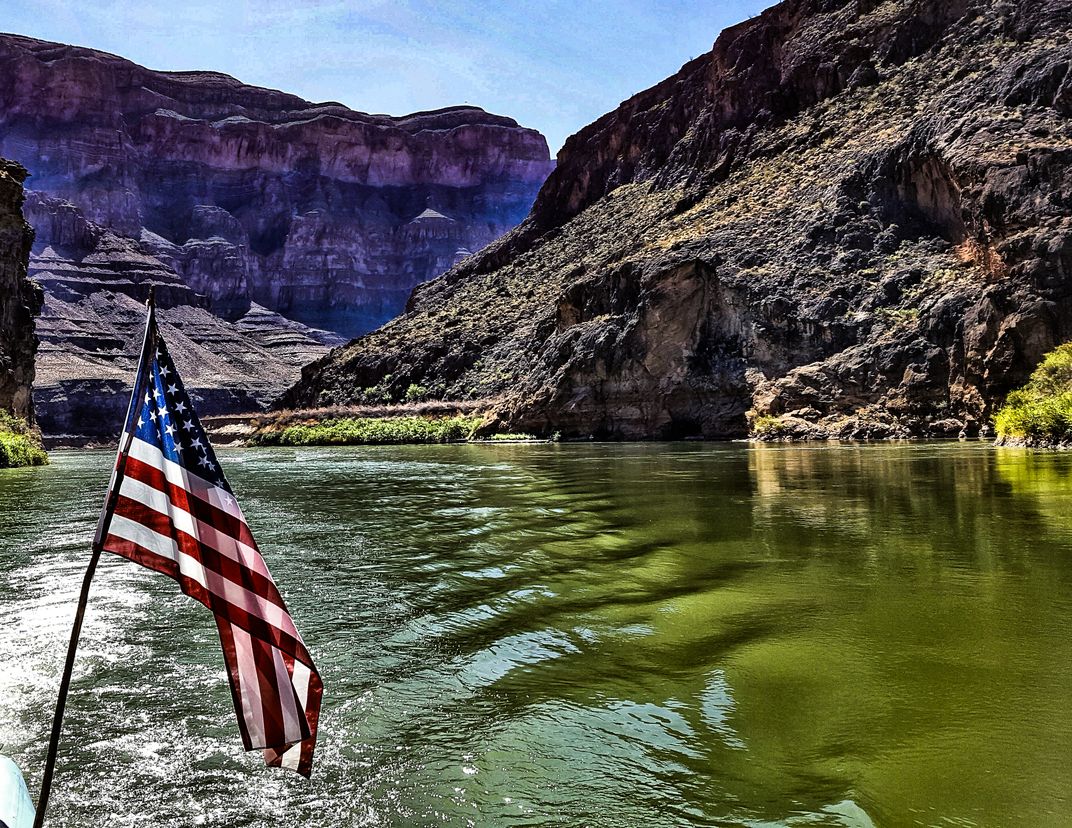 While on our rafting expedition through the Grand Canyon, we proudly flew the American flag behind the boat.