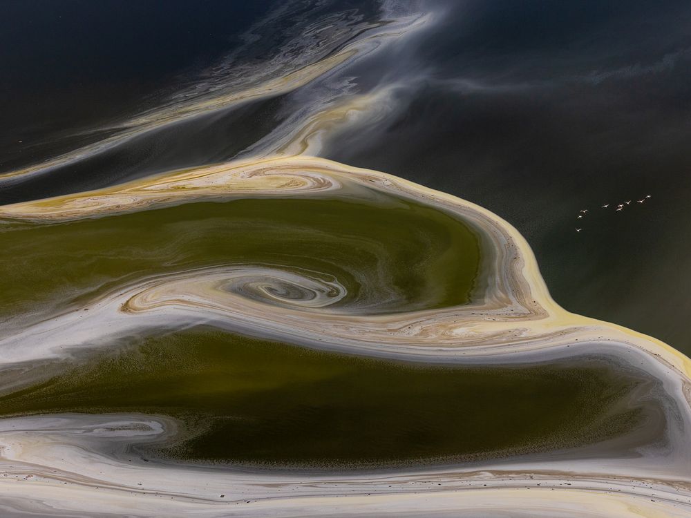 Lake Magadi is a soda lake located in the Rift Valley that is highly alkaline from dissolved sodium and carbonate, recharged by saline hot springs. The lake can take on many different colors and patterns depending on a variety of factors, including chemical reactions, algae, water evaporation and surface winds. There is a large resident lesser flamingo population that feed on the cyanobacteria and algae. The landscape of these lakes is changing, affecting the flamingo populations. There has been more rainfall and that has diluted the salinity of the soda ash lakes which the flamingos depend on to survive. Declines in healthy soda lake ecosystems threaten their unique biodiversity.
