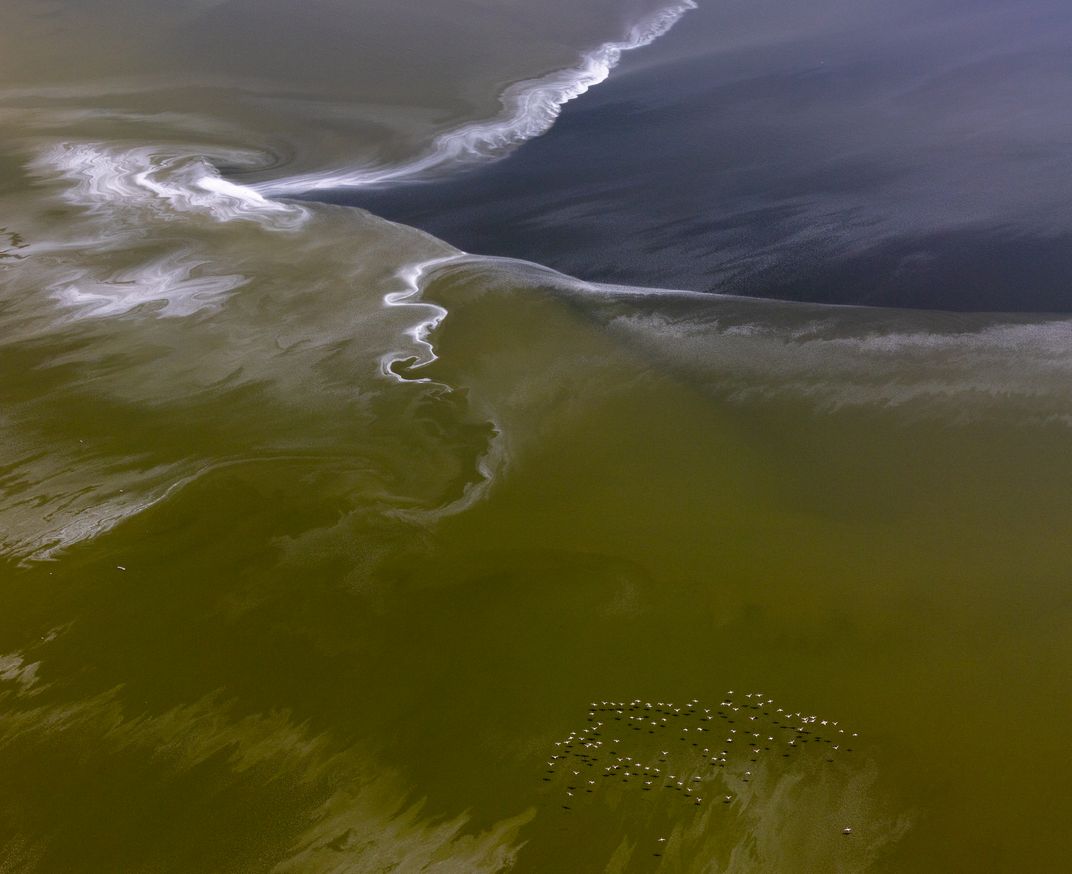 Flamingos flying over colored patterns in Lake Magadi. This is a soda lake located in the Rift Valley that is highly alkaline from dissolved sodium and carbonate, recharged by saline hot springs. The lake can take on many different colors and patterns depending on a variety of factors, including chemical reactions, algae, water evaporation and surface winds. There is a large resident lesser flamingo population that feed on the cyanobacteria and algae. The landscape of these lakes is changing, affecting the flamingo populations. There has been more rainfall and that has diluted the salinity of the soda ash lakes which the flamingos depend on to survive. Declines in healthy soda lake ecosystems threaten their unique biodiversity.