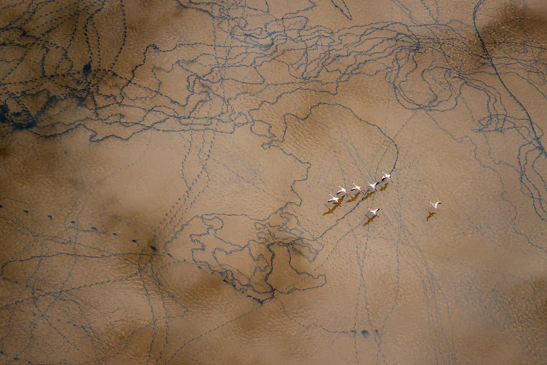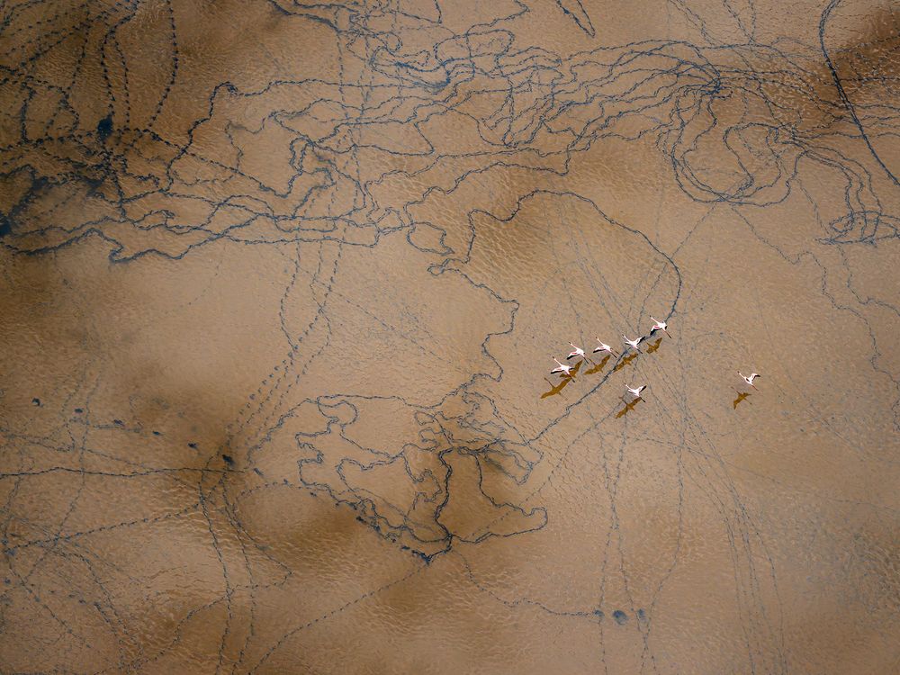 From a helicopter above Lake Natron, the patterns on the lakebed resembled an ancient hand-drawn map—etched not by human hands, but by the wandering paths of flamingos. Using a high-shutter speed to freeze a small group in flight, I captured them gliding over a tapestry of natural lines and textures that looked almost cartographic.