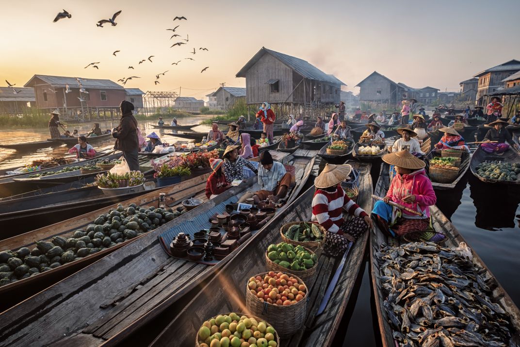 On a golden morning with a winter morning, the beauty of the floating market in Inle Lake is intriguing.