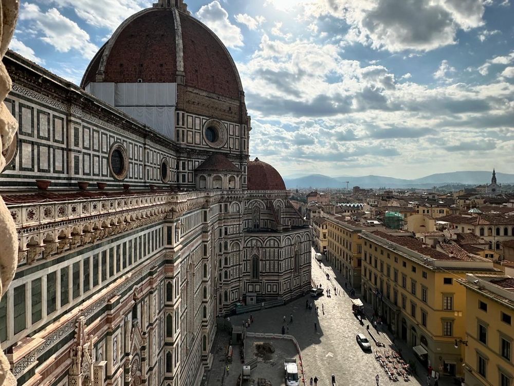 A view of Florence’s iconic cathedral, the Duomo, captured from above as the afternoon sun cuts through the clouds.