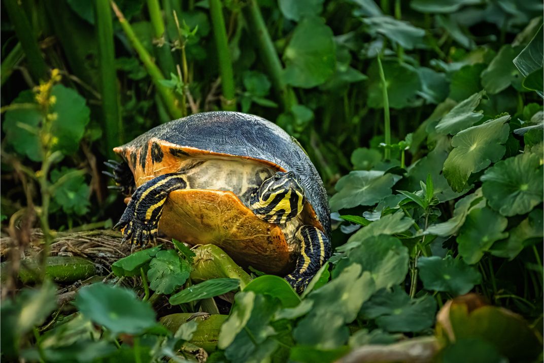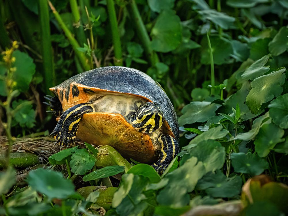 I live within walking distance of two excellent Wetlands in South Florida; Green Cay Wetland and Nature Center in Boynton Beach, Florida, and Wakodahatchee Wetlands in Delray Beach, Florida; so I am definitely a frequent visitor. Recently I decided to go one morning over to Green Cay, and just walk around the boardwalk and maybe make a few shots. As I was getting near the end of my morning, I saw this common turtle for the area, a Florida Red-bellied Cooter sort of just laying on the rushes. Since the composition allowed for a nice view of the belly of the turtle, I decided to make the shot.