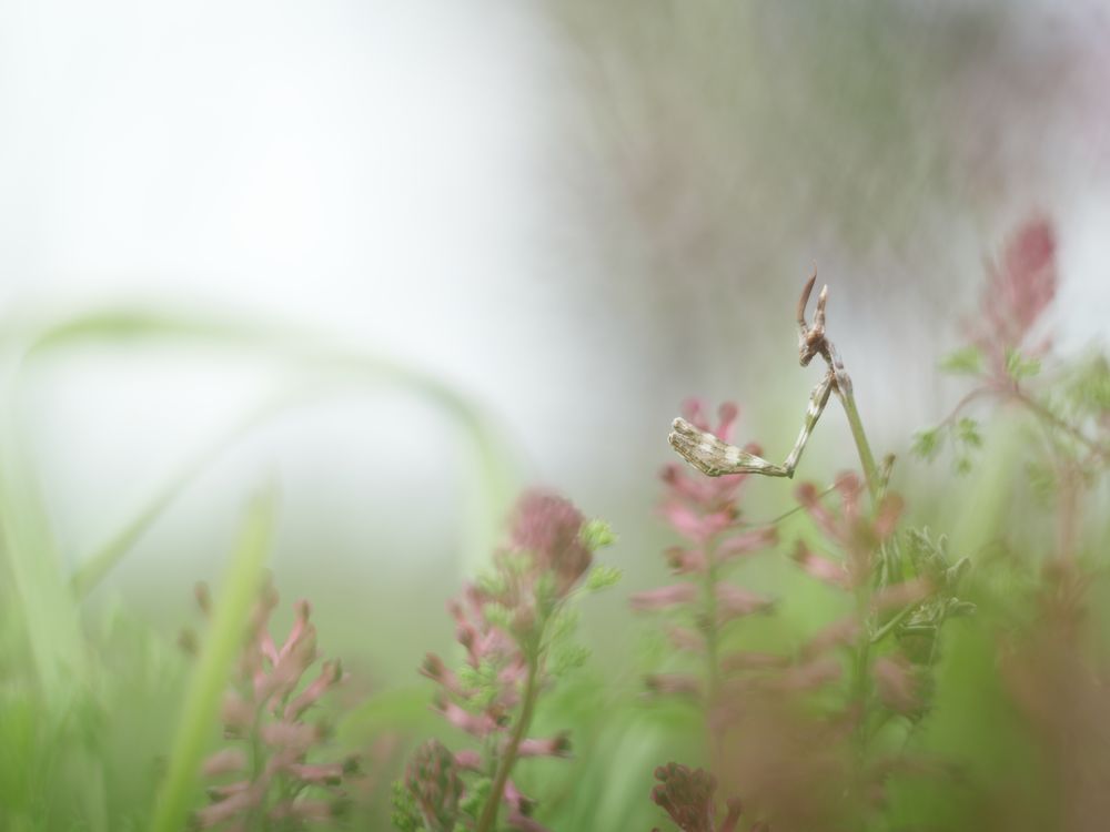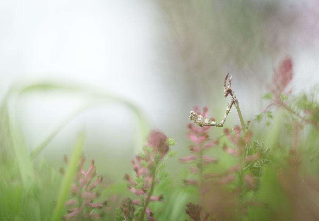 A close-up shot of a sub-adult Empusa fasciata among some flowers.
