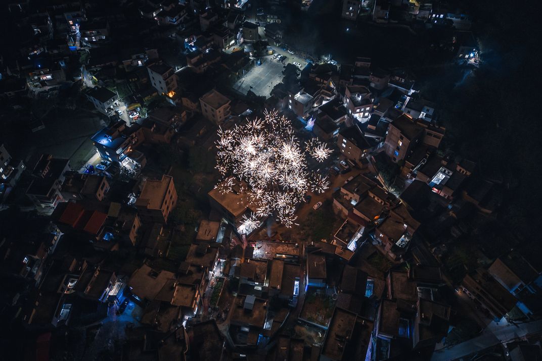 During the Chinese New Year, fireworks are always lit on rural nights, and when viewed from the air, it feels like a blooming flower in the village.