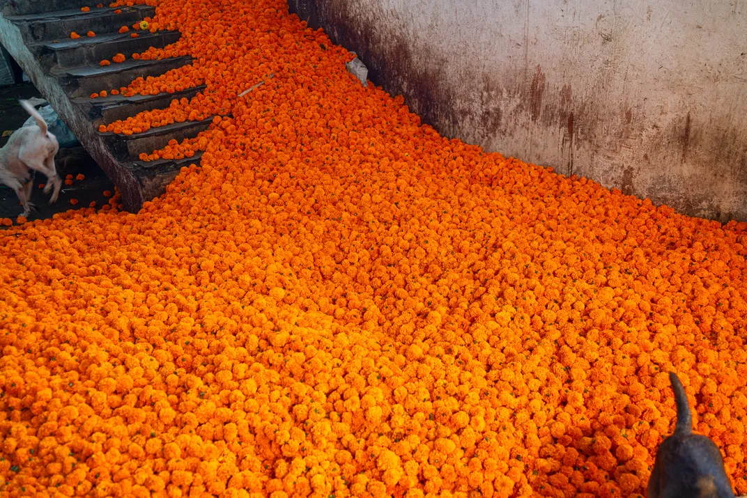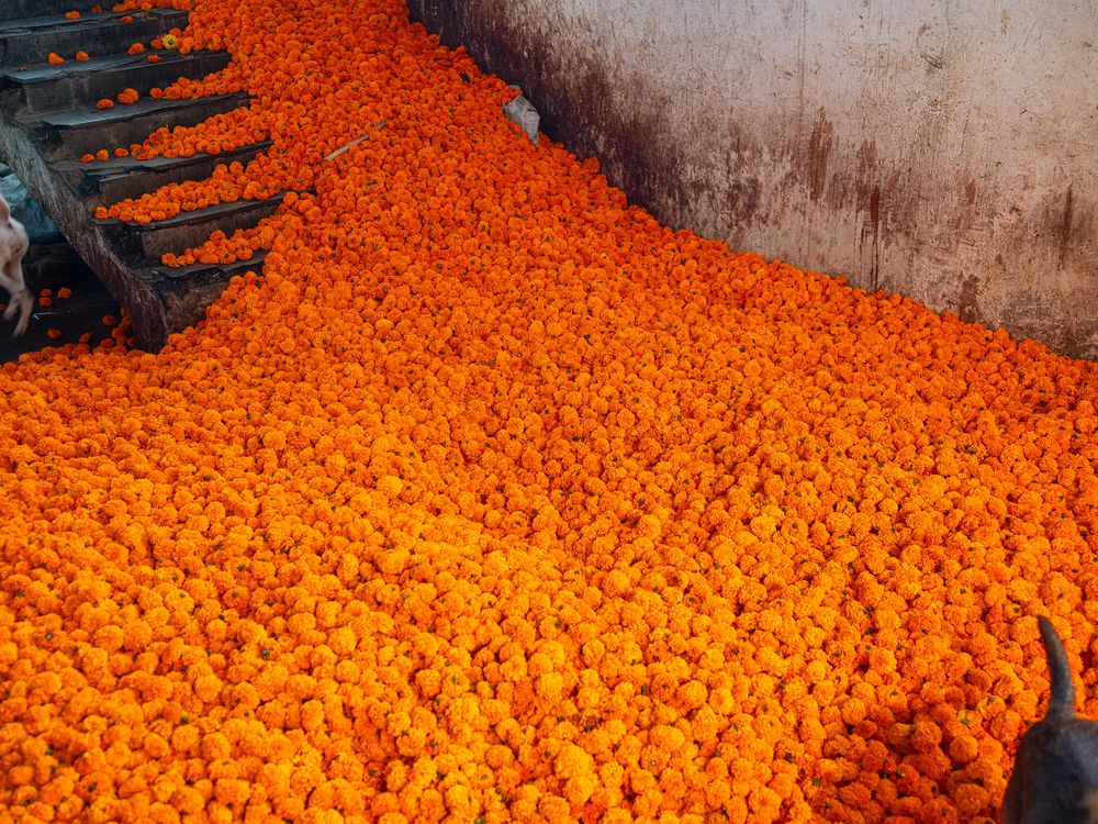 Rivers of unsold marigold flowers flow from old stone steps, painting the ground in brilliant hues that contrast sharply with their humble setting. Though discarded as waste, these blooms evoke the rhythms of local life and the unexpected beauty found on every journey. This image captures a traveller's perspective, where chance encounters and overlooked corners reveal stories of abundance, loss, and renewal, inviting us to pause and rediscover the extraordinary within the everyday.