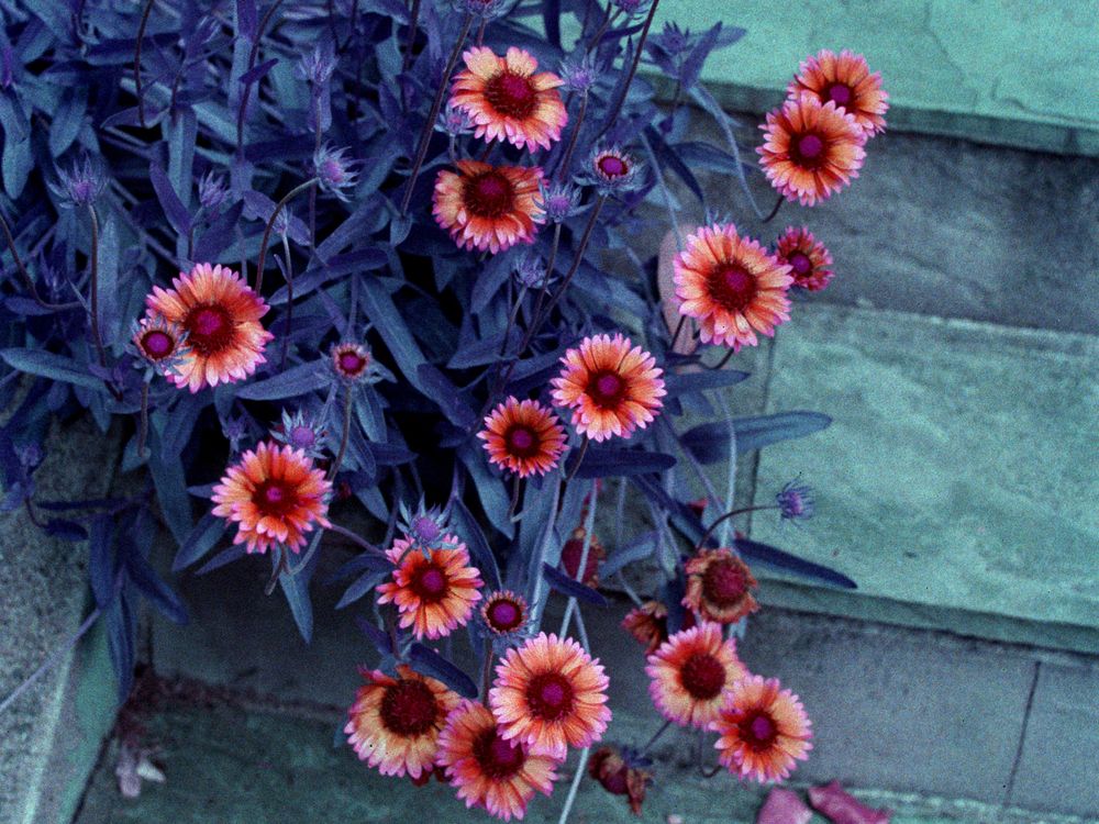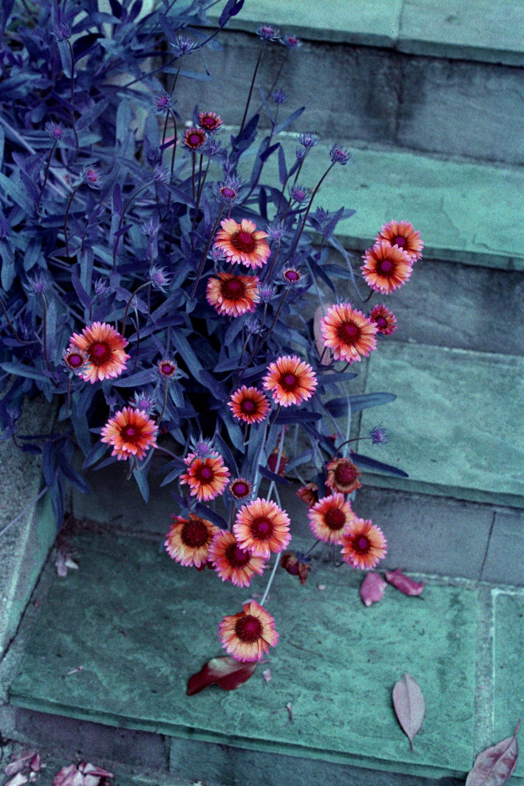 Flowers falling over slate stairs, with colors shifted by using Lomochrome Purple film.