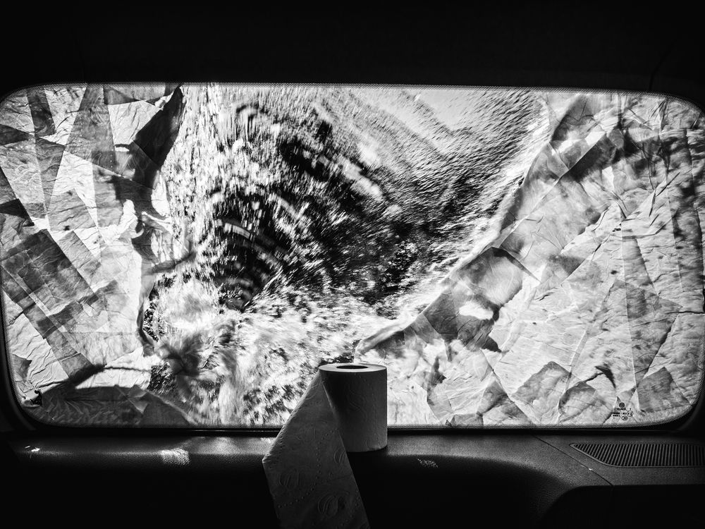 Toilet paper was attached to the outside of the car window, and a splash of water distorted it as it dissolved. Inside the car, a single roll sits in contrast to the chaotic texture outside, creating an oddly humorous and abstract moment.