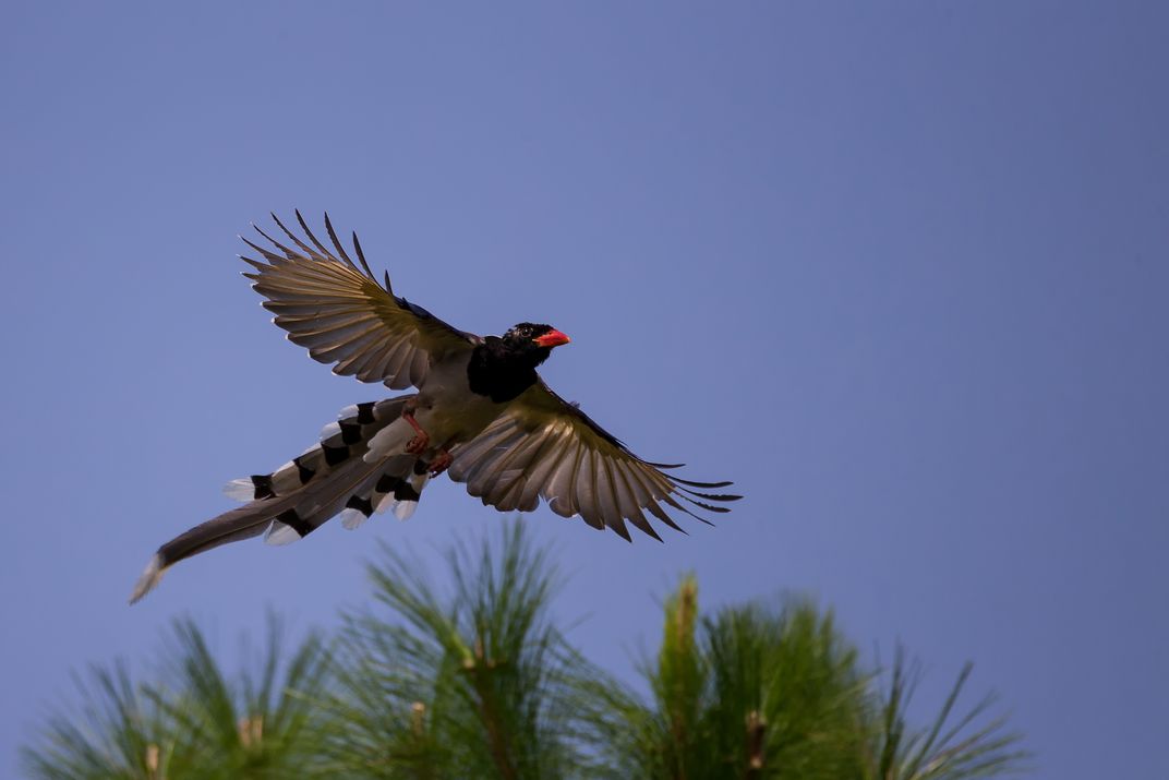 Red - billed Blue Magpie flying to catch the mate.