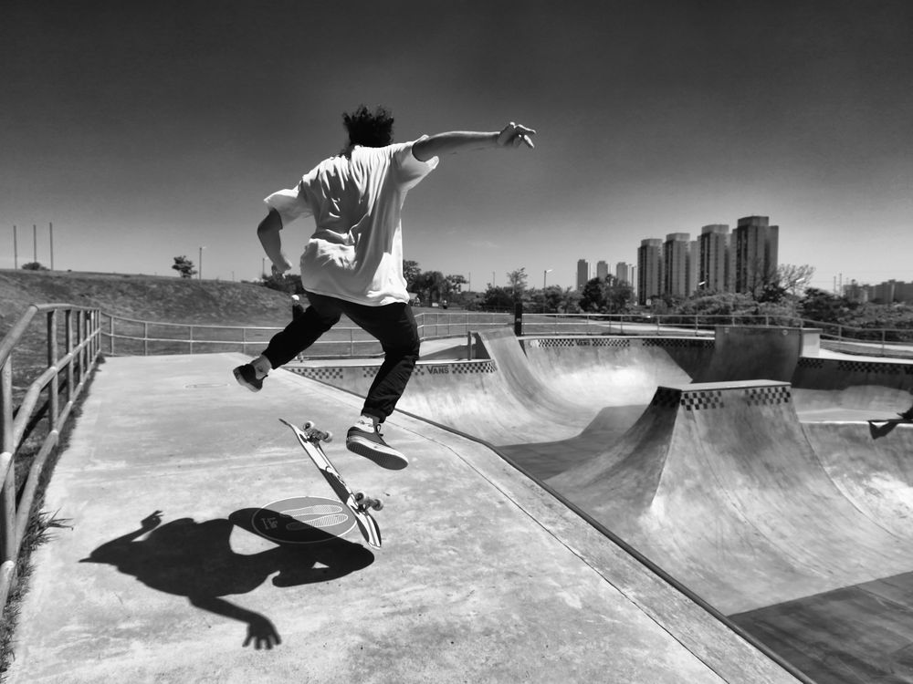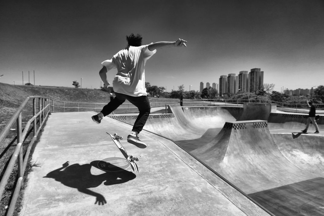 Skate maneuver on the track at Parque Villa Lobos in São Paulo.