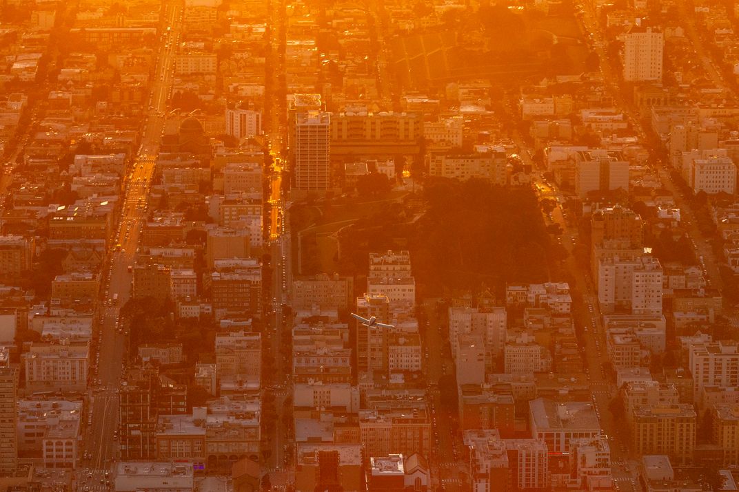 At sunset, a small aircraft glides through the radiant streets of San Francisco, threading its way above the city’s iconic grid. From the air, the ordered geometry of the American metropolis meets the improvisation of human movement — a fleeting moment where freedom, infrastructure, and everyday life intersect in golden light.
