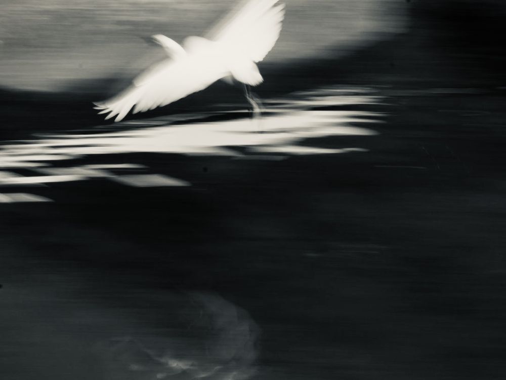 A little Egret kept flying above a dark-blue lake.