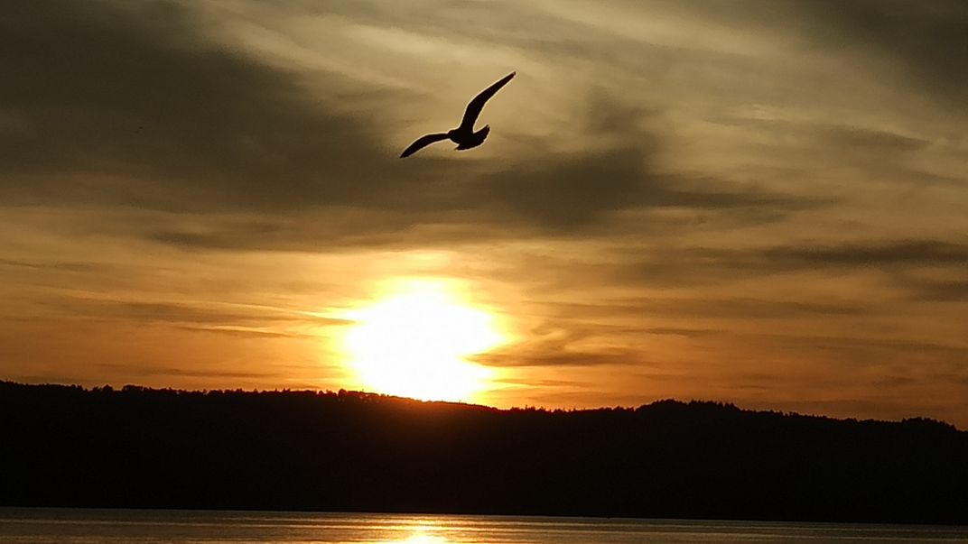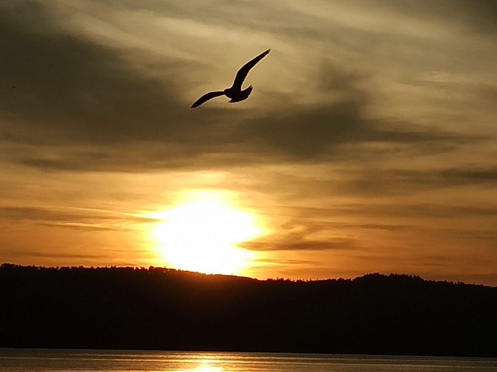 The photo shows the moment of sunset and a bird flying on the horizon of the sun.