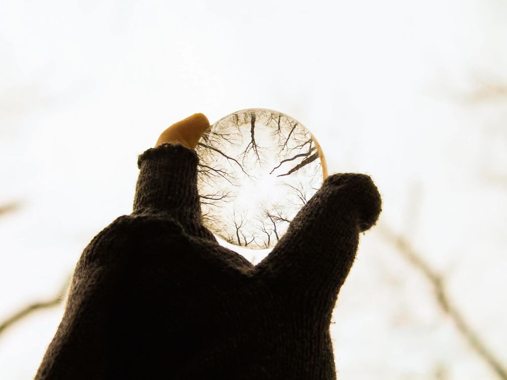 This photo is showing a crystal glass ball with trees in the center.