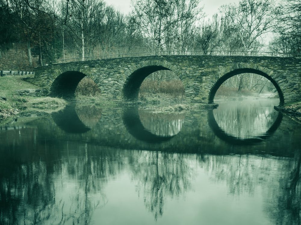 Fog creeping under a stone bridge in Kenoza Lake, NY