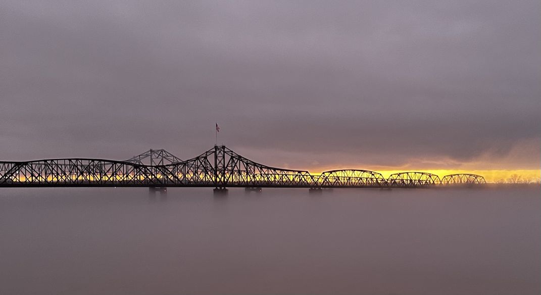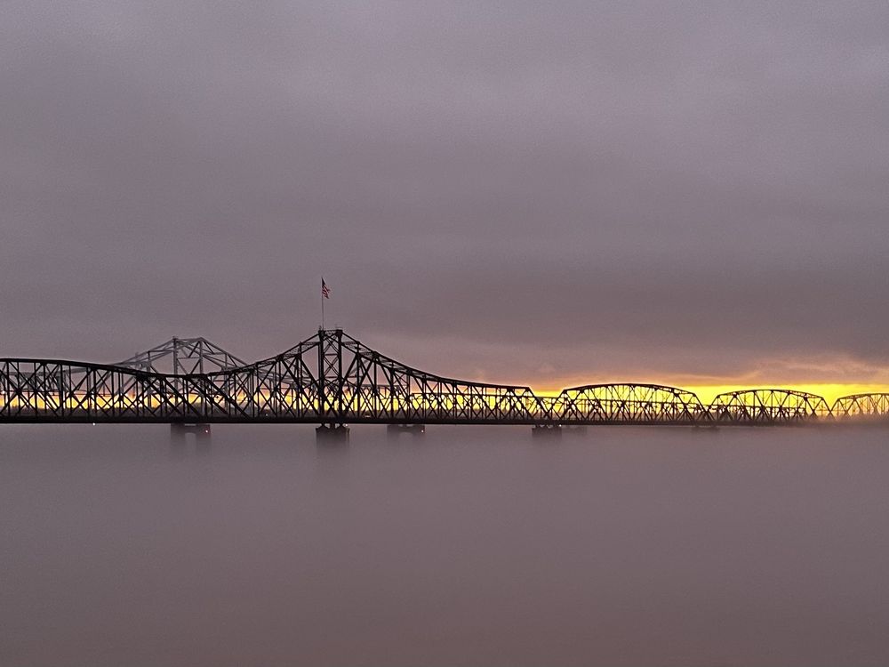A foggy evening on the Mississippi River. I’ve never seen the fog rise under the bridges like this.