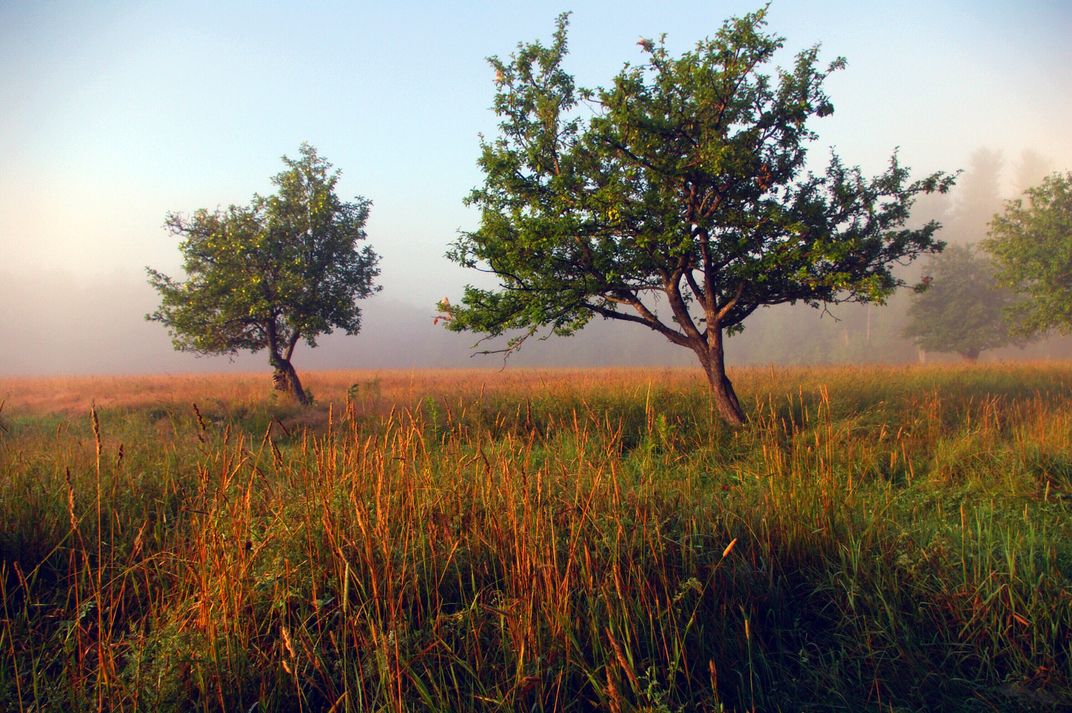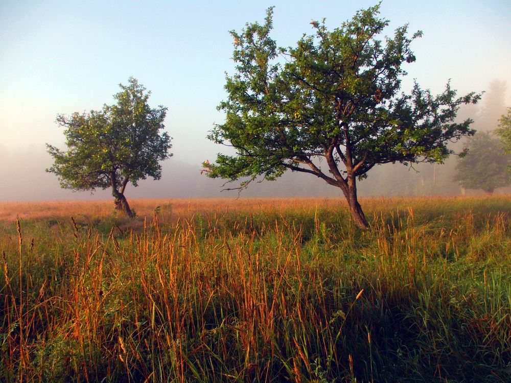foggy morning trees in field