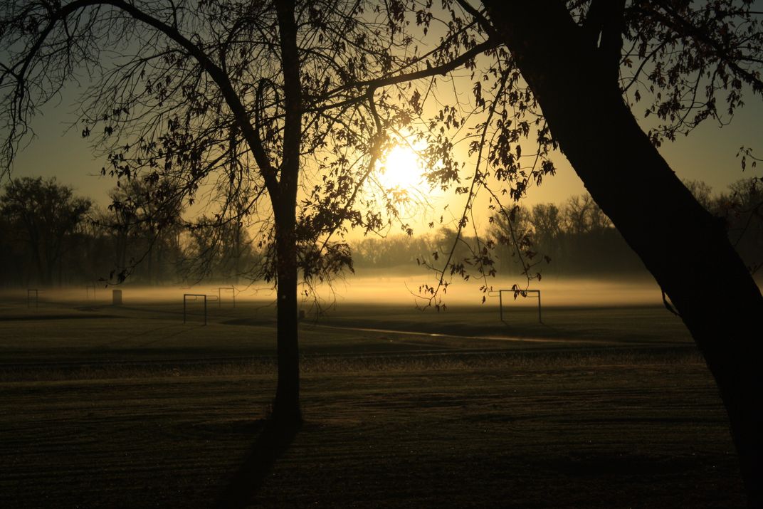 Early morning as the sun peaks over the horizon showing the density of the fog enabling the dew that rests upon the soccer field to glisten