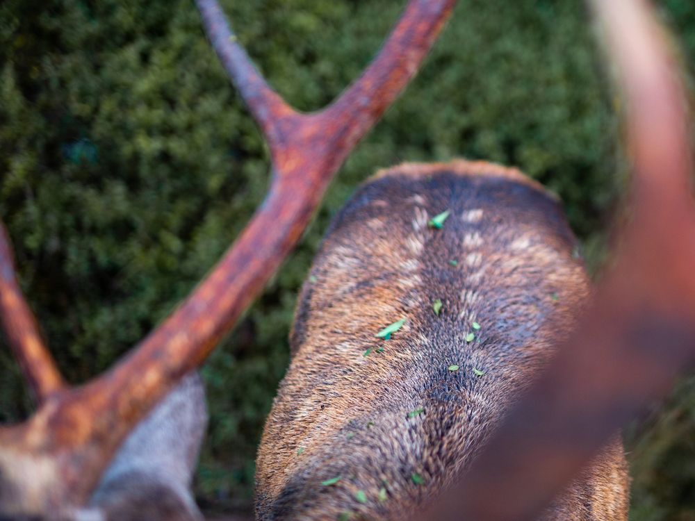 The fallen leaves on the deer's back and its spots from the frame of its own antlers.