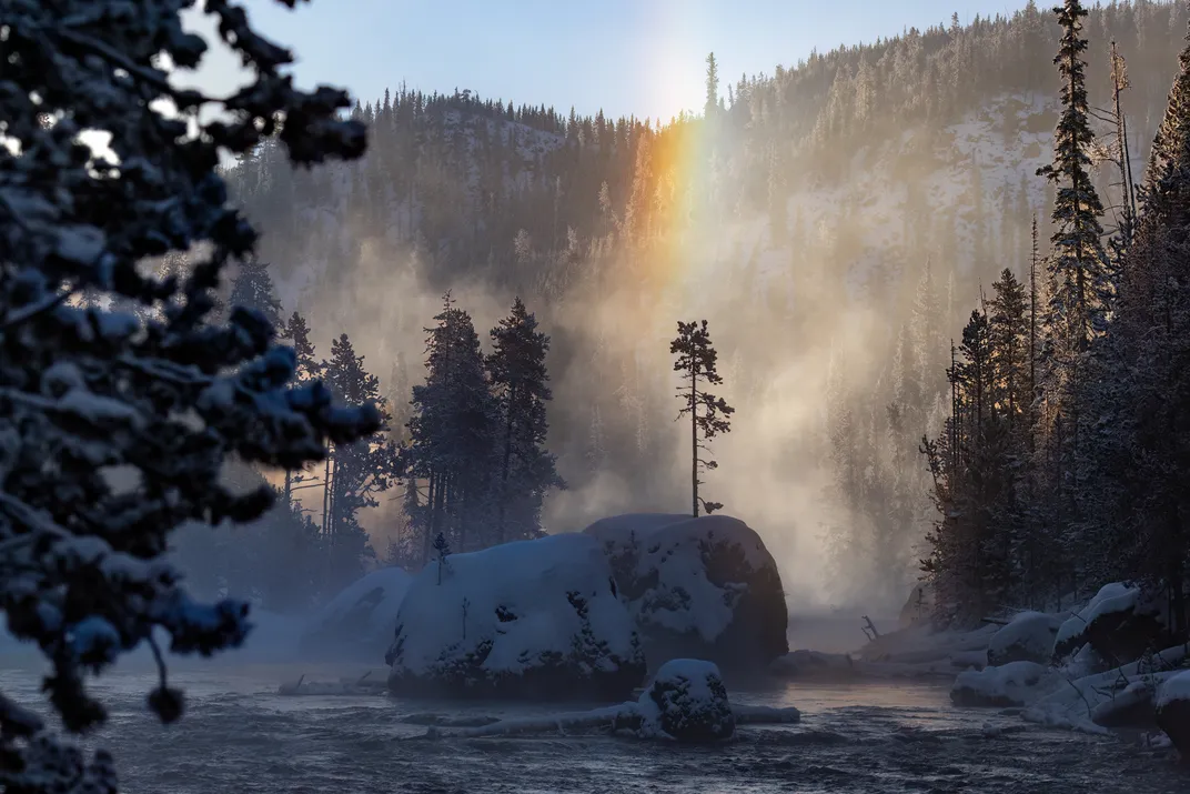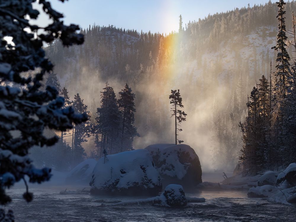 Lodgepole pines have shallow root systems to withstand high winds, which means they can grow nearly everywhere. This particular tree has been growing for decades on a boulder in the middle of the Firehole River in Yellowstone National Park.