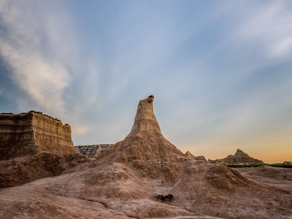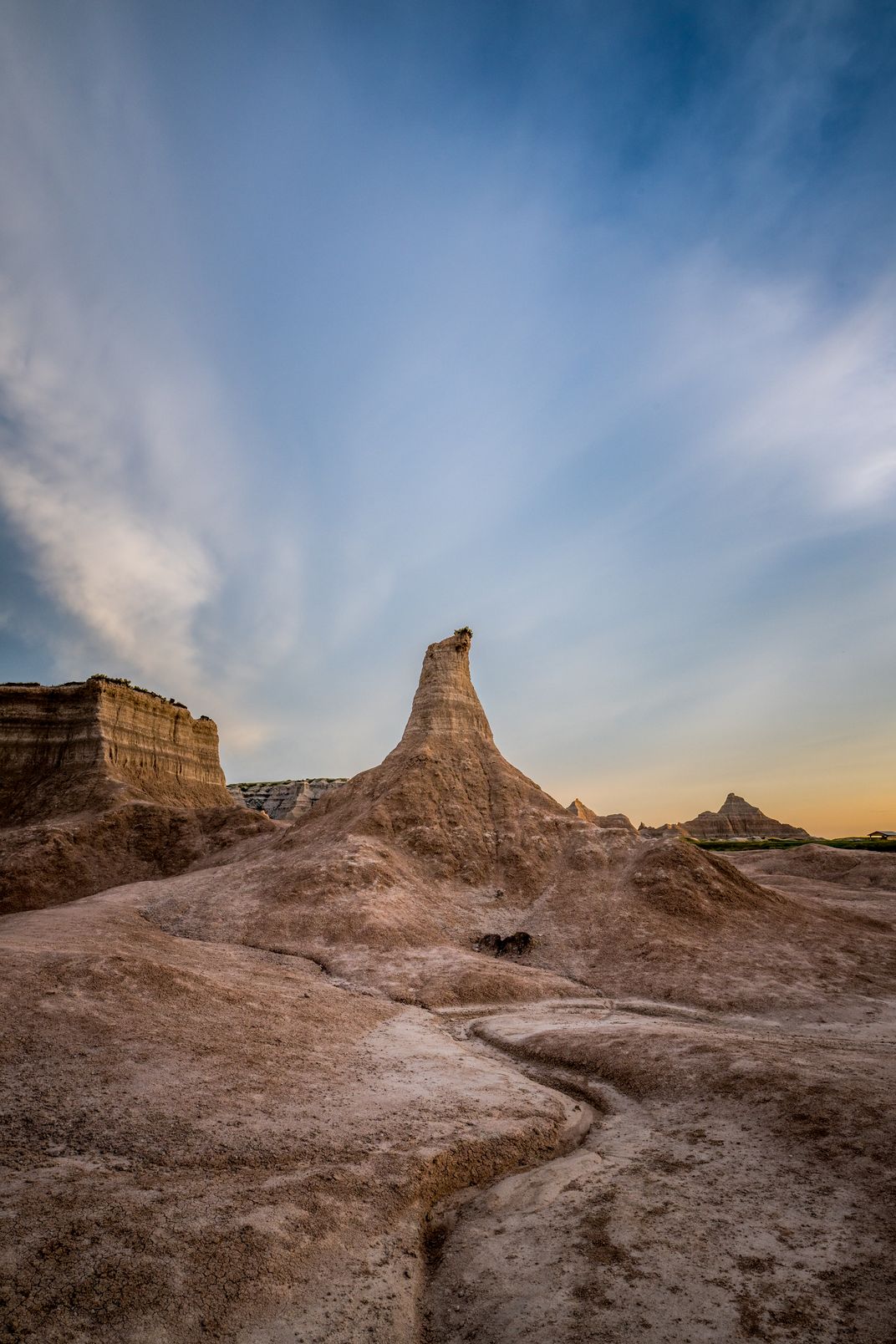 There are so many unique rock formations in the South Dakota Badlands. This is one of them. What I love about it, is the curved lines leading up to the formation. The sky helps a lot too. I feel like I am in another world here.