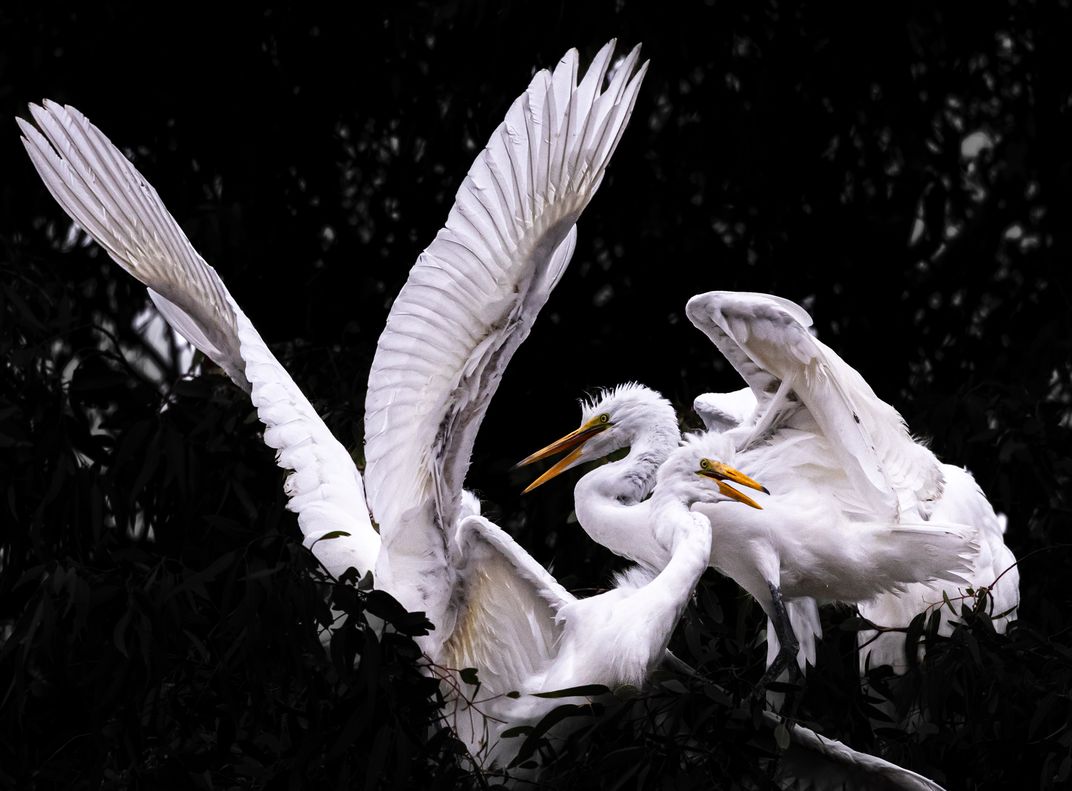 Food Fight - There is a Great Egret Rookery in Napa with several nests. During mating season there are often multiple siblings in each nest which interact with each other and compete for food brought to the nest by the parents. This shot captures two siblings in a “every chick for itself” fight over food dropped by their parent. Frequently, only the stronger chick survives over the long run of the raising stage.