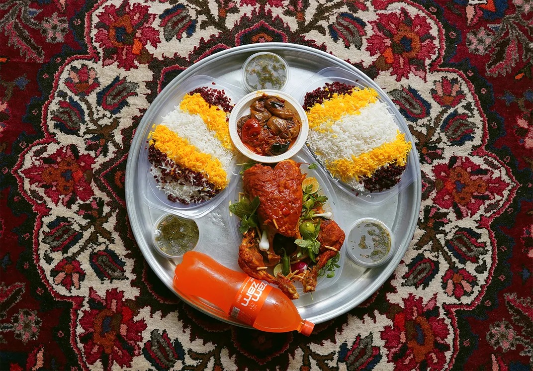 A tray of food prepared by the housewife in accordance with a 300-year-old tradition to welcome the mourners of Imam Hussein on the day of Tasu'a, and a carpet that enriches this tradition with its traditional and Iranian character.