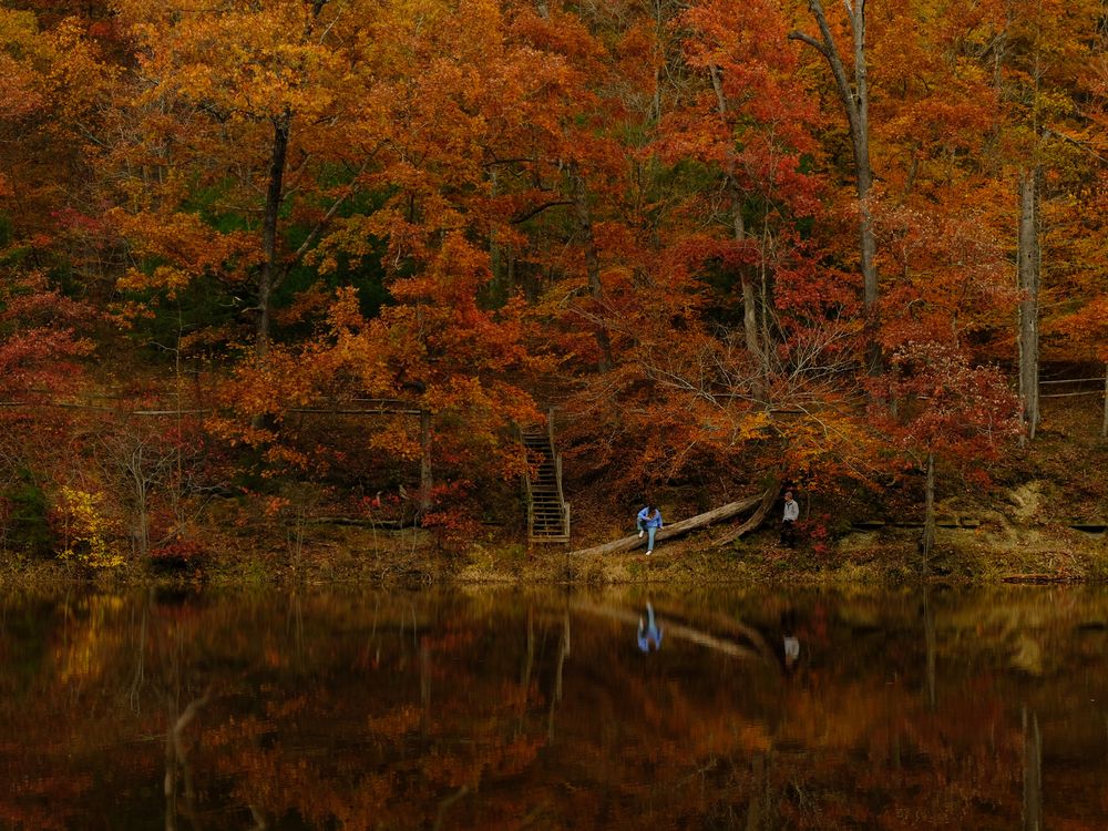 Fall surrounds two wanderers on the shore. Leaves fall softly, like quiet thoughts, while the still lake holds reflections delicately — the moment stays between where they have been and where they're going.
