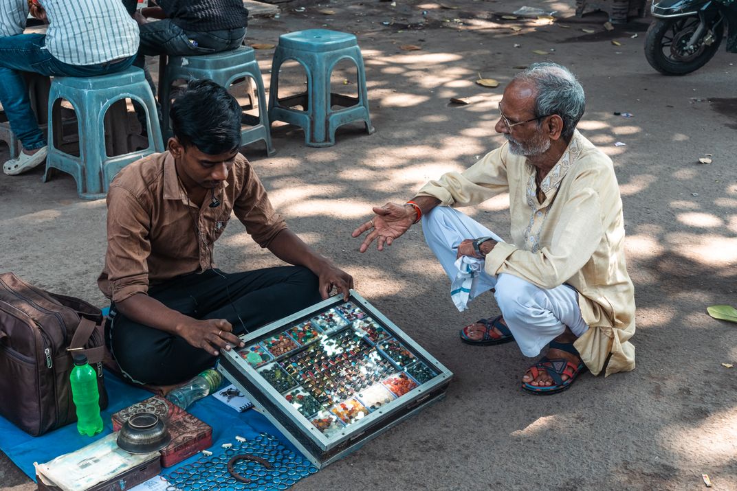 An elderly gentleman in conversation with a street vendor selling various gemstones and rings . These stones are considered auspicious by a lot of people and they wear them for luck and other benefits .