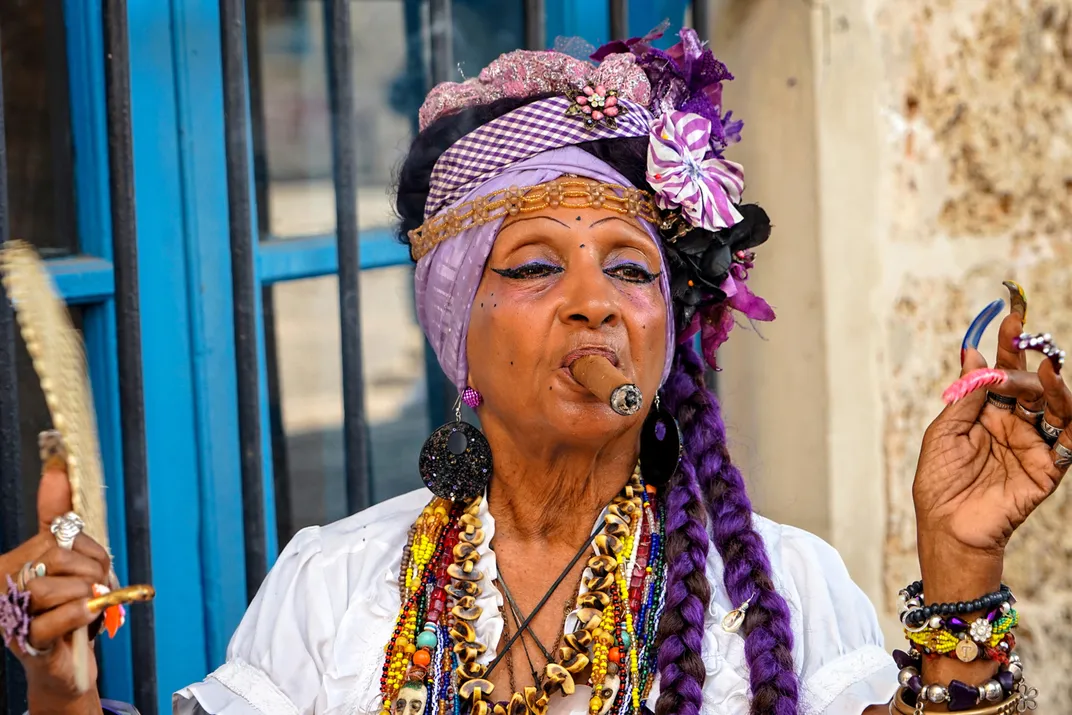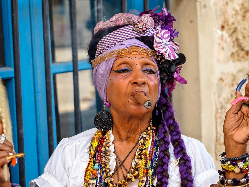 A fortune teller in Piaza Vieja holds a cigar in her mouth as she waits for customers in Old Havana. She is one of the many fortune tellers who make their living by foretelling the future through Spanish cards or by peering at the lines in the hands of their customers.
