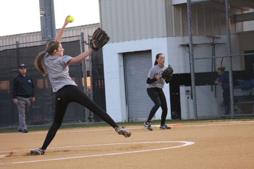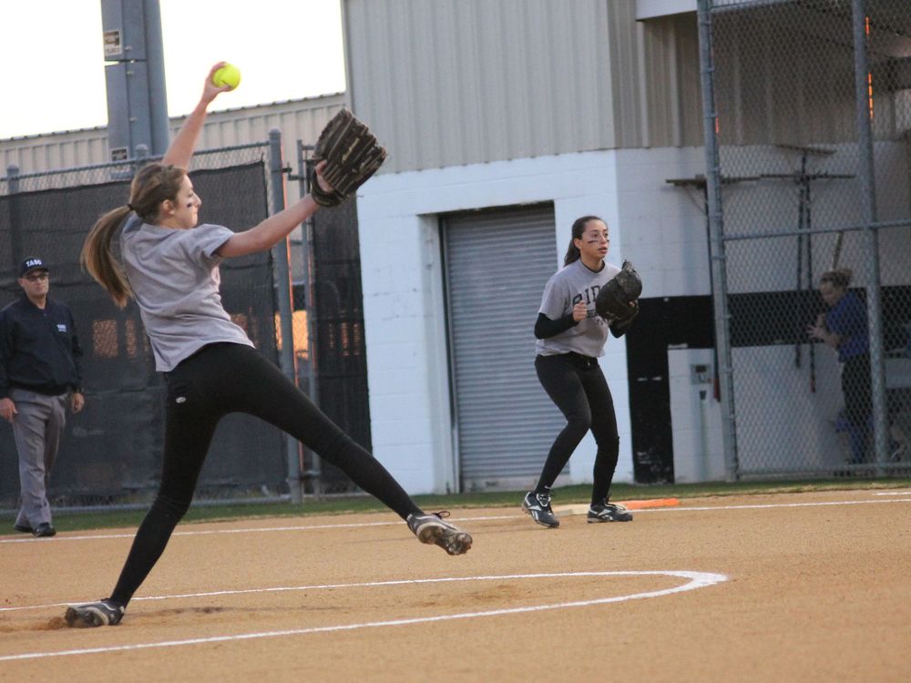 Fossil Ridge HS Varsity softball player winding up for a pitch with a bit of a bend in her foot on the mound.