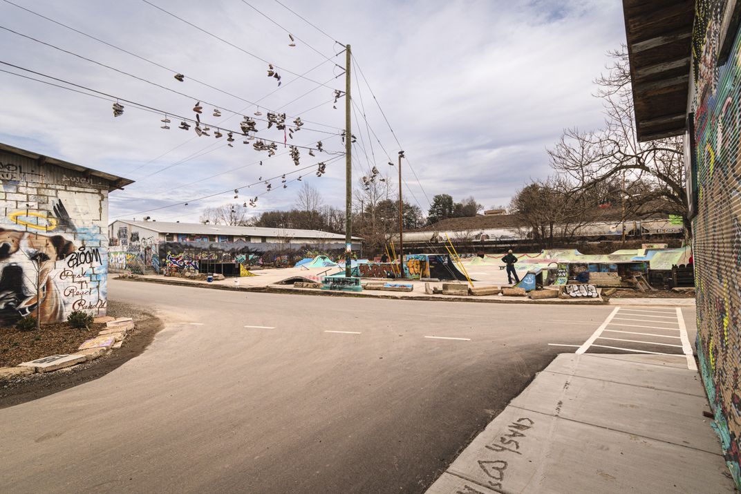 Old skate and sneaker shoes hanging over Foundation Skate Park in the River Arts District Asheville, North Carolina. The Foundation is a DIY skateable sculpture park built by volunteers. The park is free to all to use. Unfortunately, the hurricane in September of 2024 destroyed most of the River Arts District including the skate park.