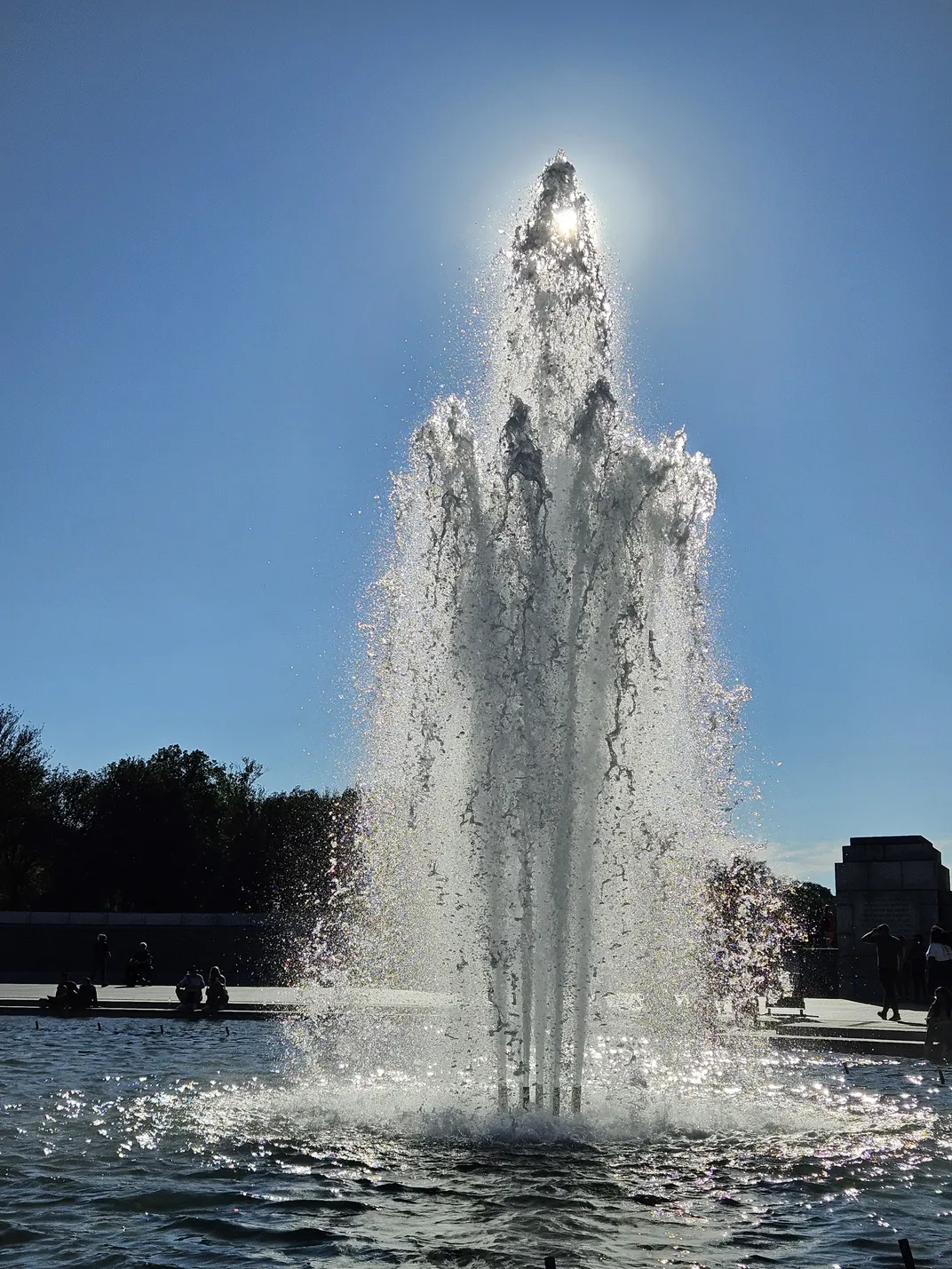 Sunlight back reflecting through water at the fountain ( World War II Memorial) in Washington DC