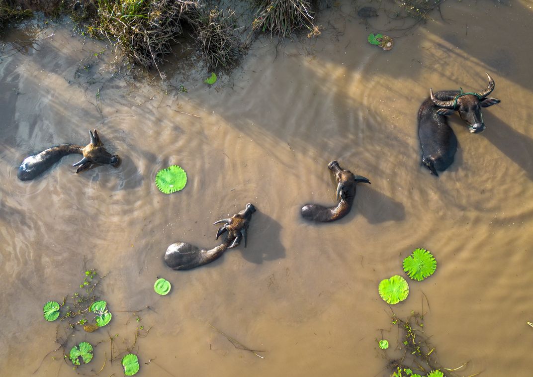 Buffaloes in a pond in Ninh Binh, Vietnam
