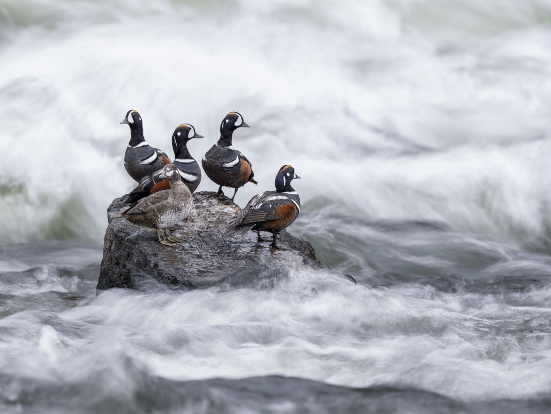 A small group of Harlequin Ducks brace against the rushing river, their patterned plumage contrasting with the bright whitewater as they rest on partially submerged rocks. The turbulent spring flow surrounds them with swirling motion and texture.