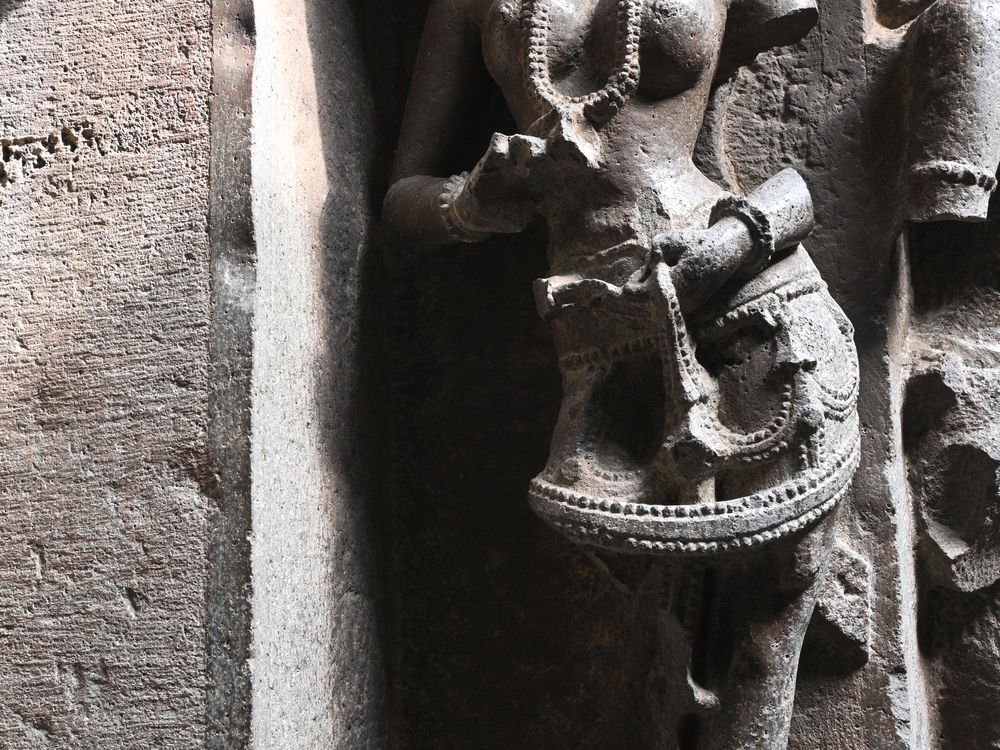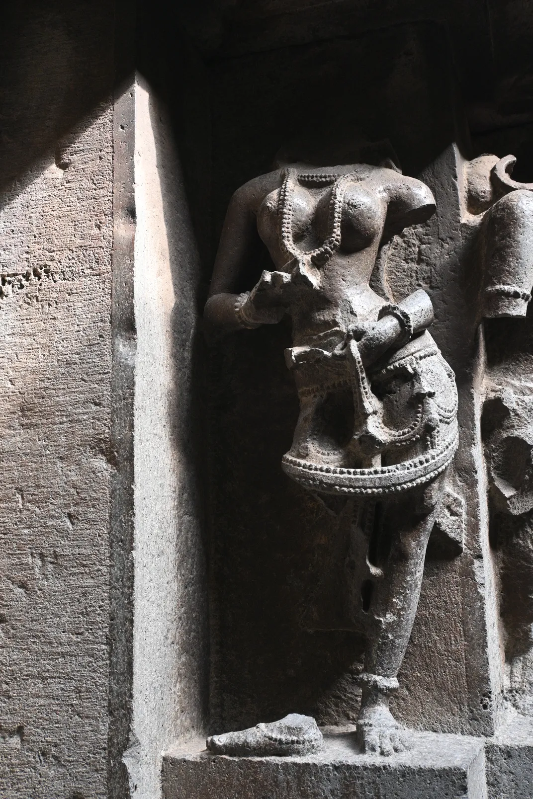 This photograph was taken on 19 July 2025 at Bhuleshwar Temple, near Pune, India. It captures a weathered stone sculpture of a goddess figure, eroded by centuries yet still radiating elegance through its delicate jewelry and intricate carvings. The missing head and arms speak to the passage of time and the vulnerability of heritage, while the surviving details reflect the artistry and devotion of its creators.