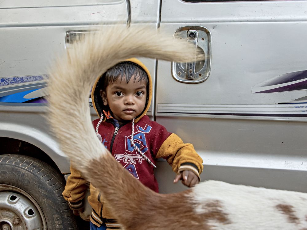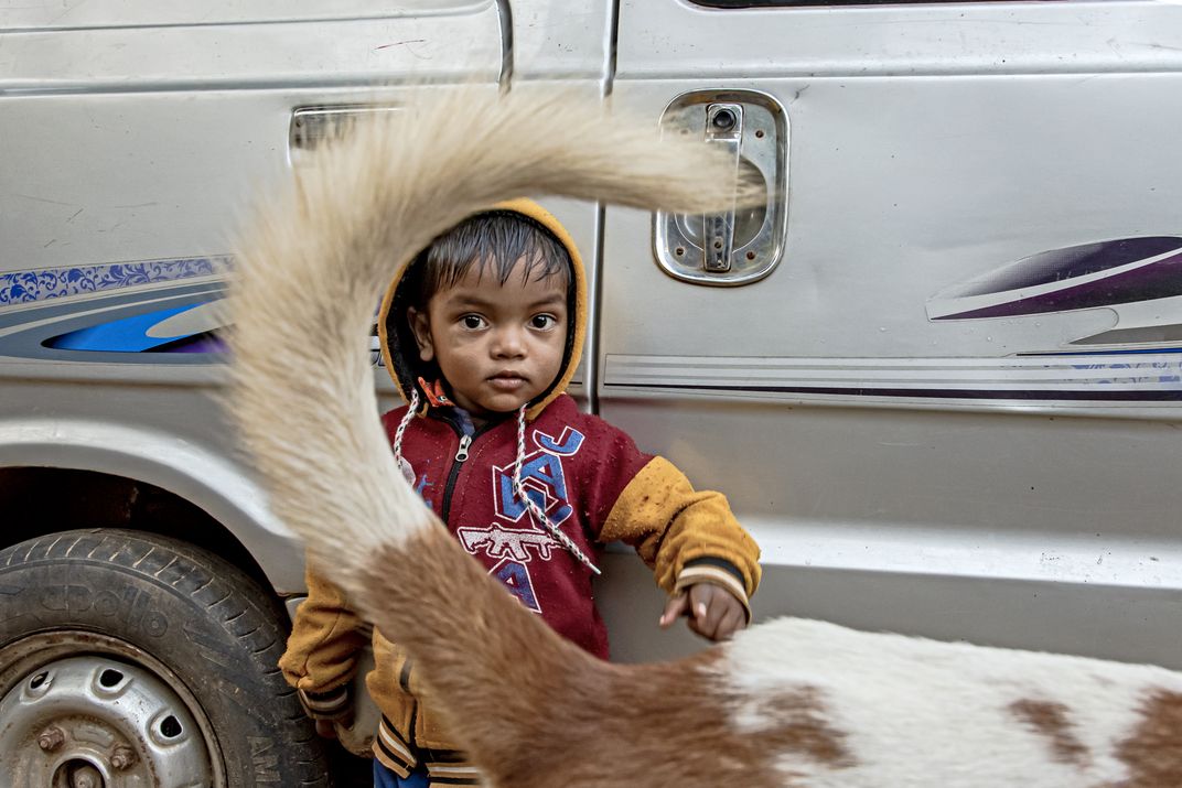 A child stands quietly against a vehicle in rural Midnapore, his curious gaze captured just as a dog’s tail sweeps across the frame. This spontaneous moment blends innocence, surprise, and the playful unpredictability of everyday village life.