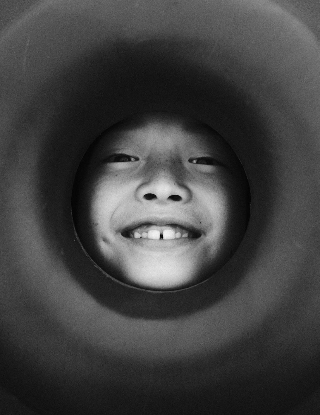 Yamato is an eight-year-old boy from a small rural town called Ena in Japan. He and his family have been traveling all over the United States of America performing traditional drumming. This image captures a quiet moment of play and introspection framed in a playground set, revealing a softer side of a child fully immersed in both cultural tradition and childhood wonder.