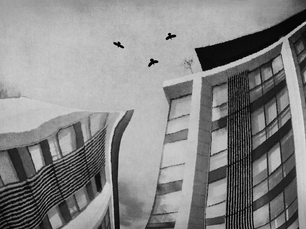 In a city of concrete and glass, freedom is severely limited even for birds.Two photos are mixed - of buildings reflected on the hood of a car and birds photographed in a park. The buildings look unreal