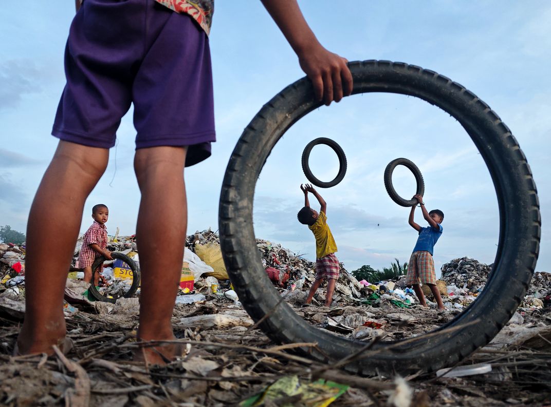 The children are playing with old tires among piles of garbage.Their families live near the garbage dump, collecting plastic bottles to earn a living. During their free time, these children play joyfully with simple things around them. This photograph captures their pure and honest happiness and to reminder that innocence can still shine brightly even in the hardest situation.