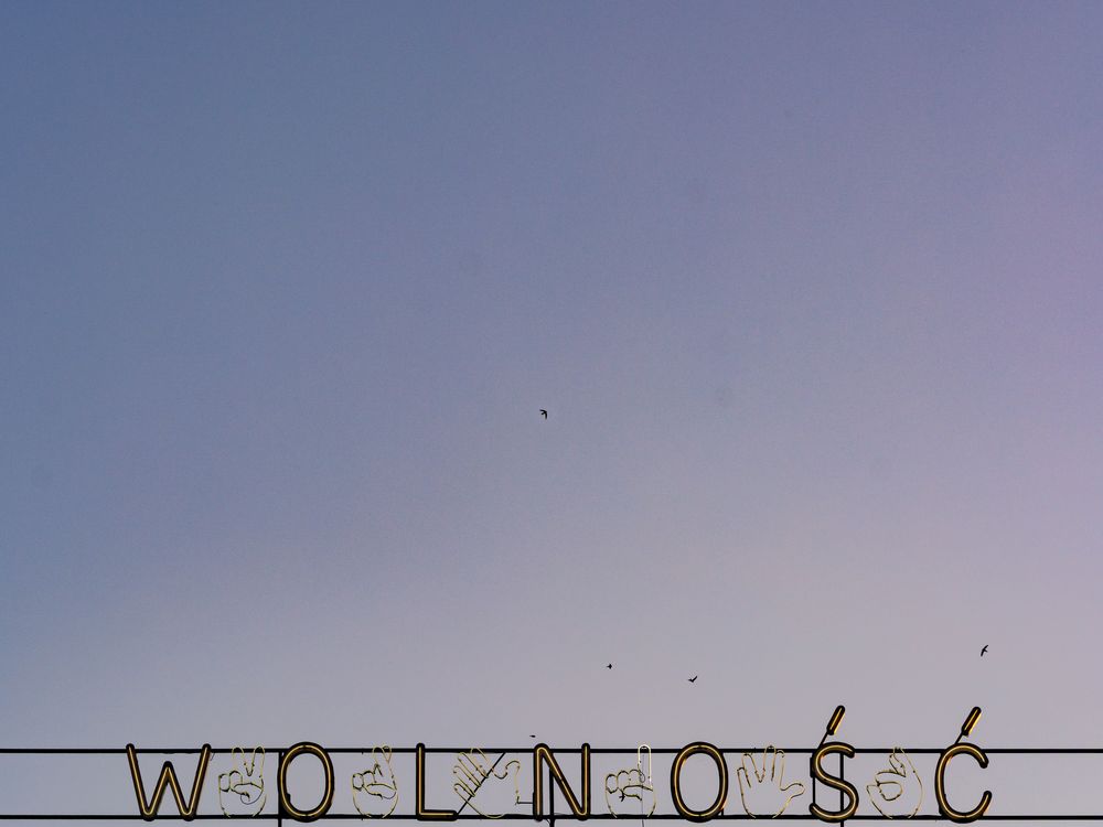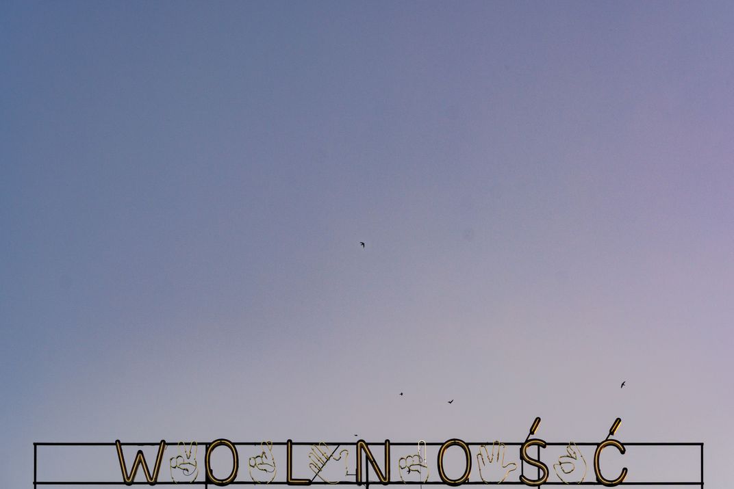 At dusk in Poznań, the neon word “Wolność” (“freedom”) glows at the bottom of the frame while swallows circle high above, a quiet moment where the sky itself seems to echo the promise of the sign.