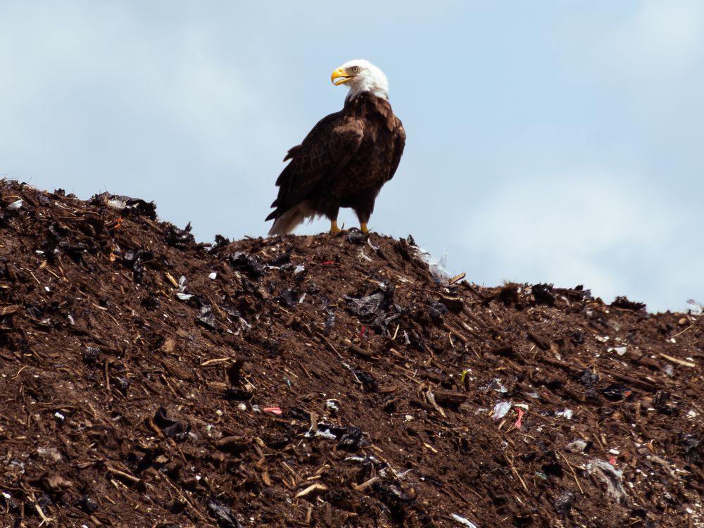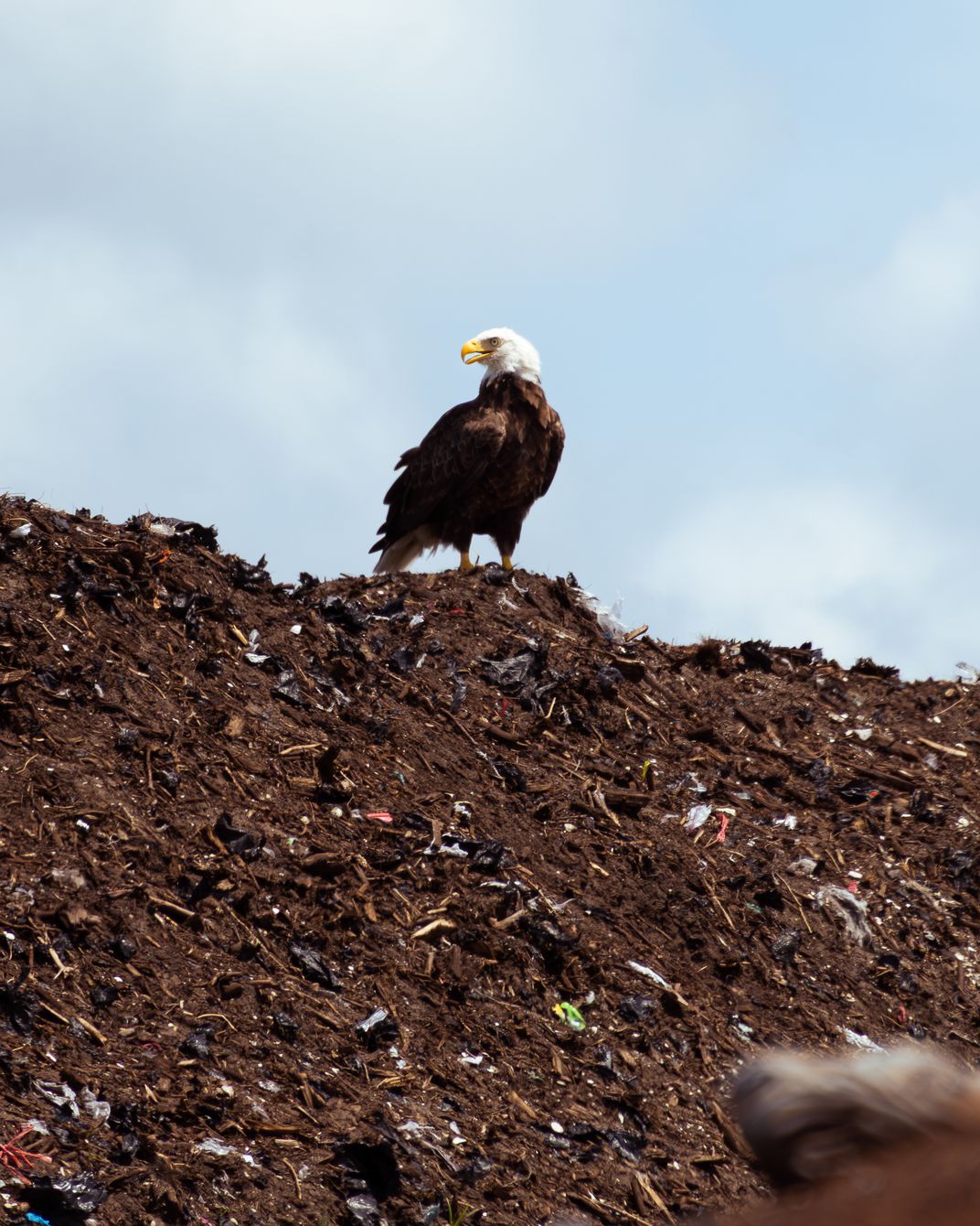 Once the proud emblem of American freedom, the bald eagle now scavenges through human waste. A reflection on a nation’s paradox where liberty’s symbol feeds on the excess of its own creation.