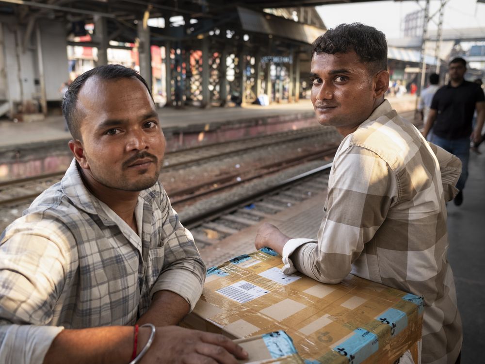 Two freight haulers with a large parcel await their train at Mumbai's Bandra Station.