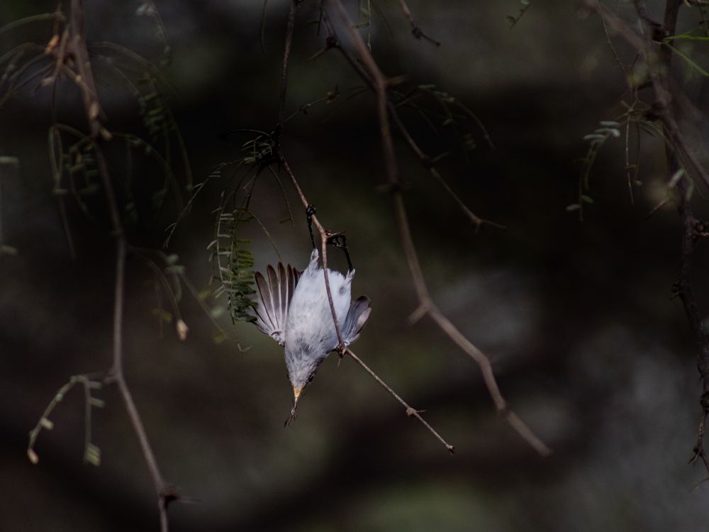 A Blue-Gray Gnatcacher grabbing onto a tree branch whilst catching a small mosquito, Gnatcatchers however, are very fast moving birds, which makes it hard to capture behaviour such as eating or catching food.