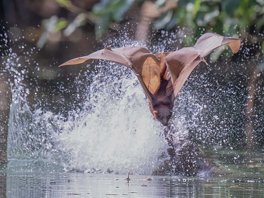 The freshwater crocodile is an ambush predator, found only in Australia. It hunts animals below, and above water. And these thirsty bats are all potential prey. These flying foxes must drink, and that presents an opportunity for the crocodiles below. The bats have adapted to the danger. They don’t drink directly from the water. Instead, they dip their bellies and wings and return to the trees to lick the moisture from their fur. But every dip places them in mortal peril. They must be quick. But the crocodile can wait. By dropping its heart rate down to two or three beats a minute, it can hold its breath for over an hour. The flying foxes are swift. Most of the time, the crocodile’s jaw snaps shut on nothing but air and water. But with so many thirsty bats, the odds are in the crocodile’s favour. The crocodile drowns the fruit bats and swallows them whole. In a single sitting, the croc has ingested enough food to sustain it for months.
