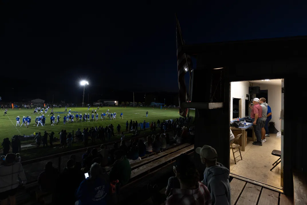 An announcer speaks during a football game between Mission High School and Plains High School on a fall night in Saint Ignatius, Montana.