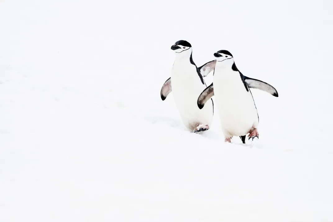 Two chinstrap penguins are happily plodding along toward their colony. For me, they project harmony in nature as they walk in synch through the great white of Antarctica.