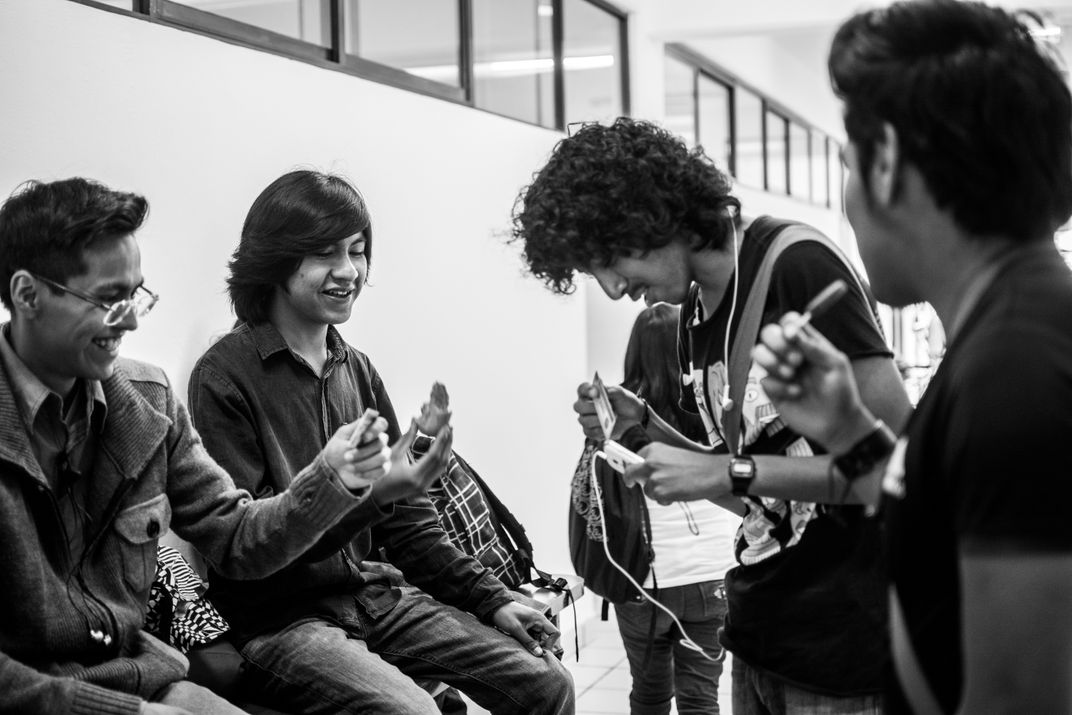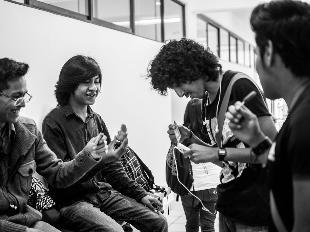 Luis (the boy with a mango) is hanging out with his friends during the school brake. Luis in indigenous and came to study anthropology to Puebla, a city of 2 million from a small village Cuetzalan in the highlands of Mexican state Puebla. The photograph is part of a series about Luis that demonstrates that indigenous people are not only the ones who dress traditionally, have 'rare' customs and are normally poor.