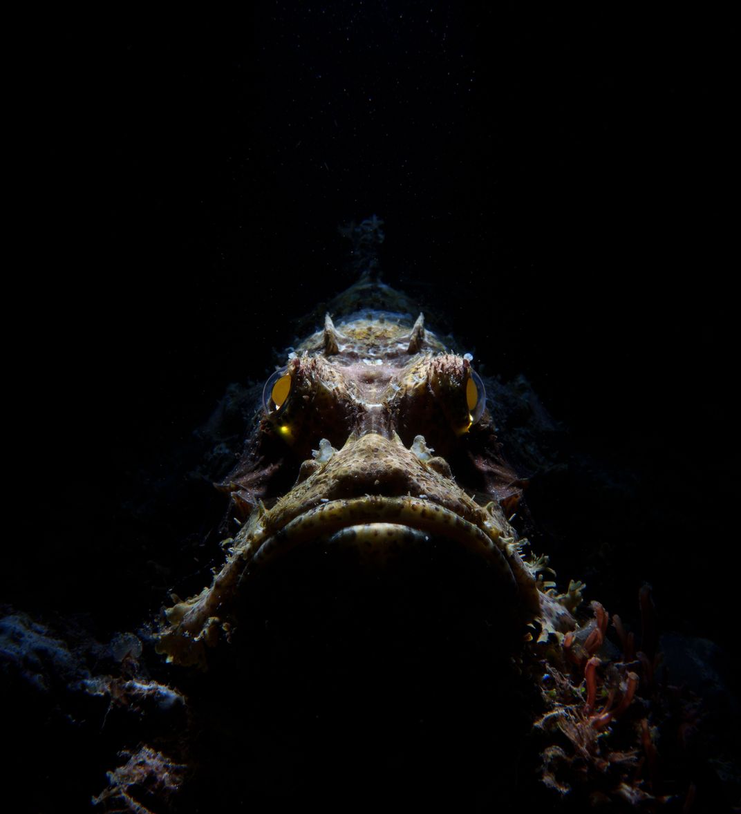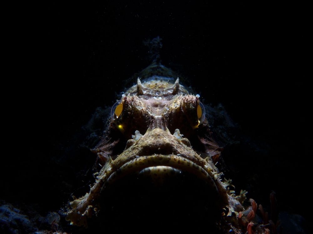 A scorpioncod partially buried in the sand waits for a meal to swim within striking distance