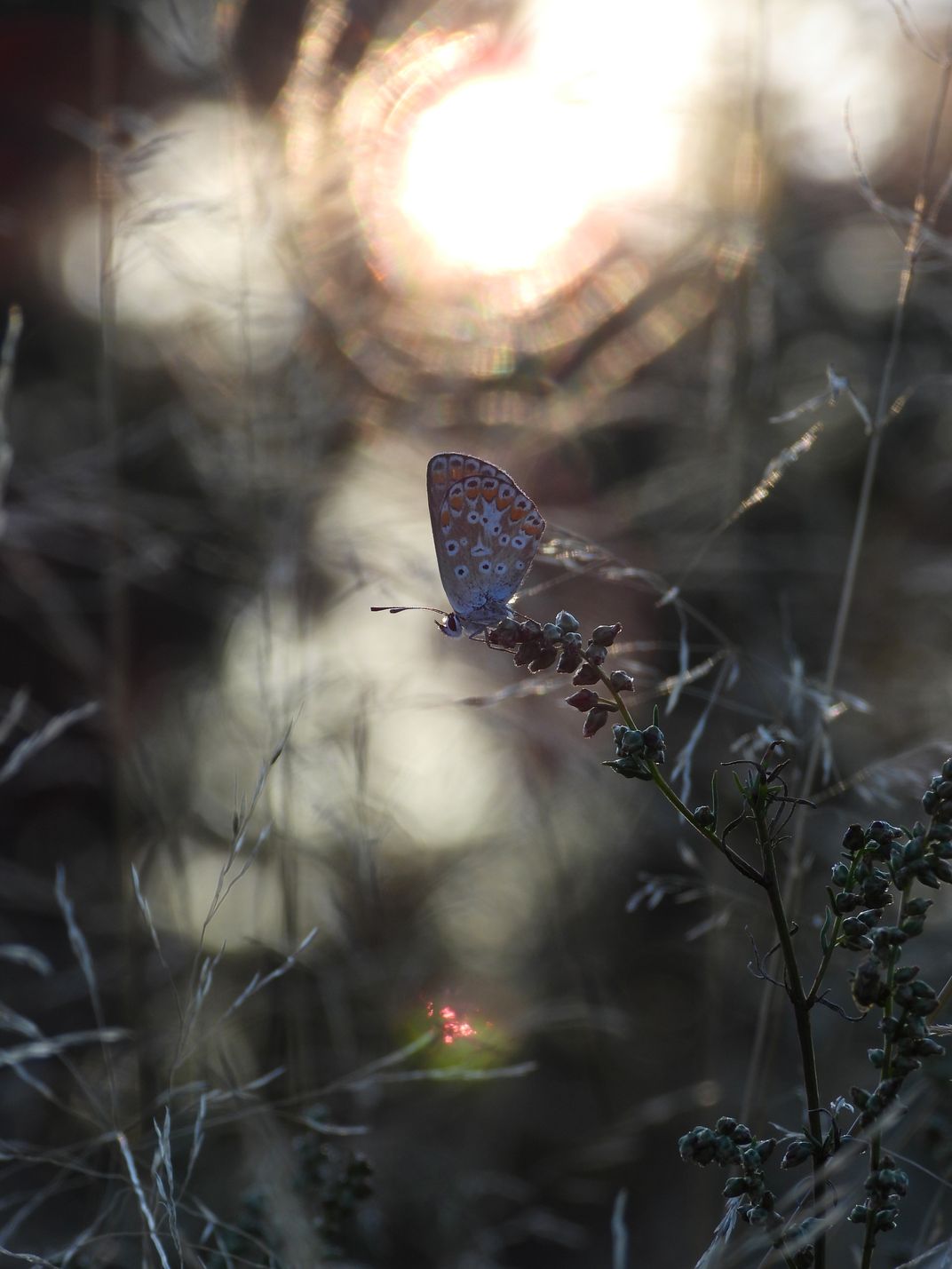 Butterflies at sunset near the city of Sarny, Ukraine. I like the mysterious colors, the game of light and shadows that the sun at sunset creates. It is a short moment - a few minutes and the sun will hide behind the trees, and the earth will be enveloped in twilight.